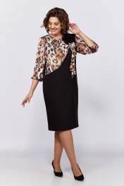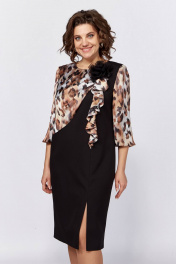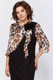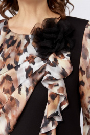 Нарядное женское платье из непрозрачной ткани средней плотности с добавлением вискозы. Силуэт полуприлегающий, длина чуть ниже колена, вырез горловины круглый с застежкой на потайную молнию по спике. По переду ассиметричная отлетная кокетка из отделочной ткани. В рельеф по переду вставлена декоративная деталь из аналогичной отделочной ткани, длиной 3/4, с небольшим напуском, по низу на резинке. Дополнительную наряядность платью придает съемный декоративный цветок из органзы.