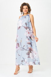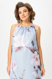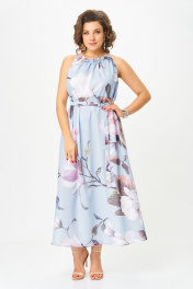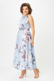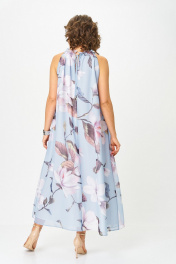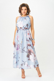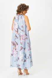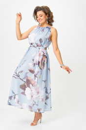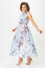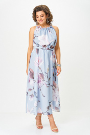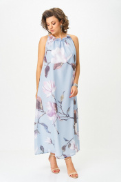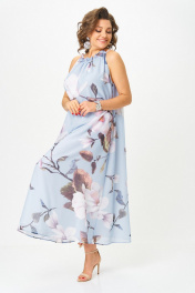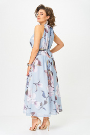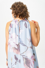 Нарядное, удлиненное женское платье без рукава. Верхний слой-прозрачный шифон с современным цветочным принтом, нижний-подкладка из ткани с добавлением вискозы. Силуэт расширенный к низу, вырез горловины по переду круглый, по спинке У-образный, по горловине небольшая рюша, брители с завязками по спинке и нарядными наконечниками. Пояс сьемный на полу кольцах.