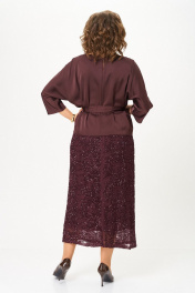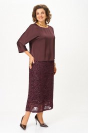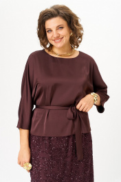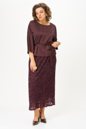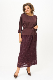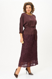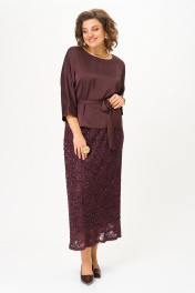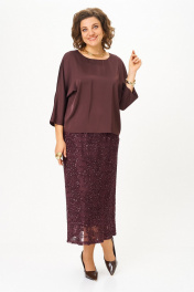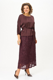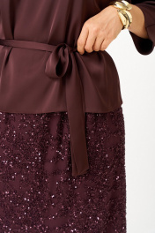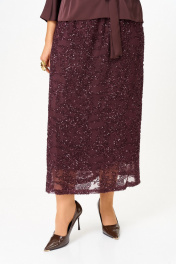 Нарядный женский комплект, состоящий из блузы и юбки. Блуза из атласной ткани с добавлением шелка, с цельнокроенным рукавом 3/4, вырез горловины "лодочка" с застежкой на петлю с пуговицей по спинке, пояс съемный на завязку. Юбка прямая двойная, верхний слой - сетка с паетками, нижний - атлас, пояс отрезной по талии.