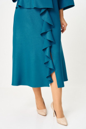 Нарядное женское платье из плательной ткани с легким блеском. Удлиненное, силуэт полуприлегающий, по переду отрезное по линии талии, с баской, воланом в шве и высоким разрезом по низу, вырез горловины круглый, с застежкой на потайную молнию в среднем шве по спинке, рукав 3/4 расширенный к низу. 52-54-56 ширина по талии 47,5-49,5-51,5 ширина изделия под проймой 54,5-56,5-58,5 ширина по бедрам 61-63-65 ширина спинки 40-40-40 длина по среднему шву 123-123-123 ширина рукава под проймой 21-22-23 длина рукава 49-49-49 ширина рукава по низу 21-21,5-22