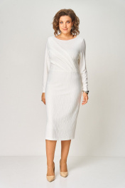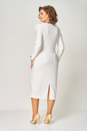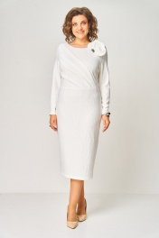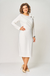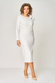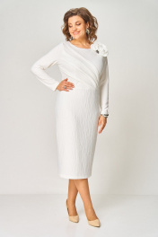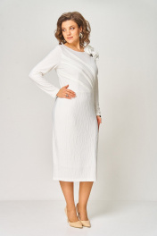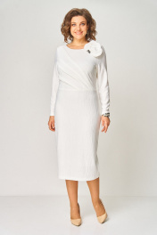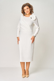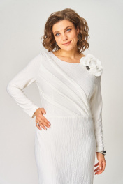 Нарядное женское платье из трикотажного полотна с добавлением вискозы, с оригинальной выпуклой фактурой с рисунком в тон. Силуэт полуприлегающий, по переду отрезное по линии талии, по лифу наклонные бантовые складки, вырез горловины круглый, рукав длинный, по спинке в среднем шве разрез. Съемный цветок украшен декоративными пуговицами-стразами.