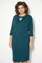 Нарядное женское платье из трикотажной ткани с добавлением люриксовой нити,прямого силуэта, длиной до середины колена, отрезное по линии талии, лиф с небольшим напуском на резинке, рукав цельнокроеный длиной 3/4, вырез горловины круглый с планкой по переду и застежкой на петлю и пуговицу по спинке. Особый шарм платью придает вышивка нитью с блеском и вставкой из прозрачной сетки по переду платья.