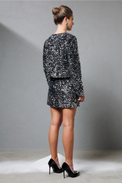 Роскошный комплект из мини жакета и мини юбки. Эффектный мини жакет, выполнен из бархата, на который настрочены пайетки. жакет на подкладке, без застежки. Мини юбка. Выполнена из бархата с настроченными пайетками. Юбка на резинке, Длина юбки 42/44 - 44 см, 46/48 - 48 см.
