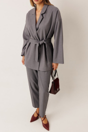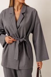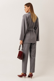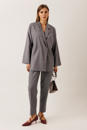 Комплект состоит из жакета и брюк: жакет из поливискозы : – прямой силуэт, крой кимоно – мягкий, обеспечивает свободу движений – на подкладке – застёжка потайная на кнопки – воротник пиджачного типа – спинка лаконичная – в комплекте пояс из основной ткани брюки из поливискозной ткани: – слегка зауженный к низу – узкий пояс, застёжка на молнию и пуговицу – по переду — складки и карманы с наклонным входом – универсальный вариант для офиса и повседневной носки