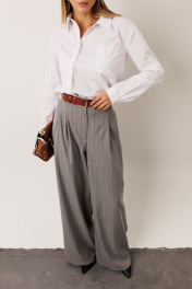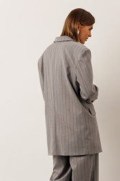 Комплект состоит из жакета и брюк: жакет в полоску: – прямой силуэт,удлинённый – по переду — карманы с клапаном – центральная застёжка – воротник классический пиджачный – рукав втачной со сборкой на уровне локтя – в комплекте пояс с регулировкой приталивания – на подкладке – универсален: можно носить с брюками и джинсами, а также самостоятельно с плотными леггинсами и высокими сапогами брюки в полоску: – широкие – по переду — две складки – карманы в боковом шве – пояс по спинке на резинке (для удобства и хорошей посадки) – по боковому шву пояса — паты с декоративной пуговицей – застёжка по переду на молнию – идеальны для мягкого, свободного образа
