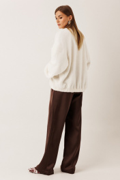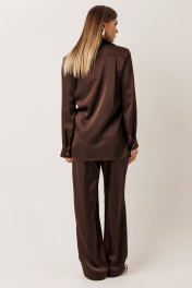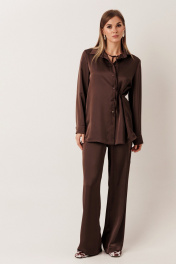 Комплект состоит из блузки и брюк: блузка из атласа: – свободный силуэт – трансформер: можно носить приталенно, застегнув потайной ремешок, или создать расслабленный образ, завязав внутренние ленты и спустив на плечи. брюки из атласа: – прямой силуэт – пояс на резинке – по переду расположены карманы