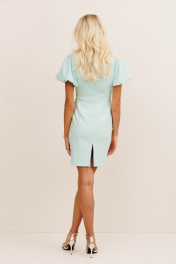 Платье‑футляр: - облегающий силуэт - фигурная горловина с декоративным кантом - акцентные рукава‑фонарики - средний шов по спинке - потайная молния по спинке