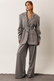 Жакет в полоску: – прямой силуэт – удлинённый – по переду — карманы с клапаном – центральная застёжка – воротник классический пиджачный – рукав втачной со сборкой на уровне локтя – в комплекте пояс с регулировкой приталивания – на подкладке – универсален: можно носить с брюками и джинсами, а также самостоятельно с плотными леггинсами и высокими сапогами Брюки в полоску: – широкие – по переду — две складки – карманы в боковом шве – пояс по спинке на резинке (для удобства и хорошей посадки) – по боковому шву пояса — паты с декоративной пуговицей – застёжка по переду на молнию – идеальны для мягкого, свободного образа
