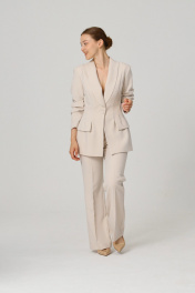 Костюм женский двупредметный из костюмной поливискозной ткани, состоящий из жакета и брюк. Жакет однобортный, приталённого силуэта, длиной ниже линии бёдер. Перед с фронтальной застёжкой на петлю-пуговицу, талиевыми вытачками и фигурным рельефом, переходящим в декоративный фигурный клапан переда и спинки чуть ниже линии талии, подчёркивающий силуэтность. Спинка со средним швом, талиевыми вытачками и фигурным рельефом, переходящим в тот самый фигурный клапан. Воротник шалевый. Рукав длинный втачной двушовный с чуть акцентным плечом. Жакет на поливискозной подкладке. Брюки прямые, классической длины, слегка аккуратно расклешённые от линии колена, со "стрелками", с застёжкой спереди, с функциональными боковыми карманами. На задних половинках талиевые вытачки. Брюки на притачном поясе со шлёвками и резинкой сзади. Размер 42 84-64-92 Размер 44 88-68-96 Размер 46 92-72-100 Размер 48 96-76-104 Размер 50 100-80-108.