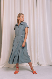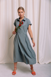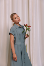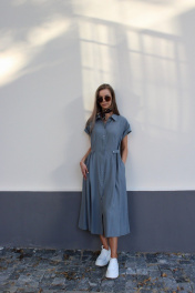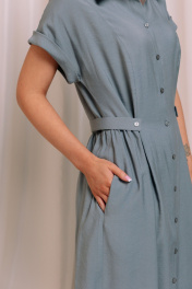 Платье-рубашка из вискозы длины миди. Спереди выполнены рельефы, застежка на планку с пуговицами, воротник рубашечного типа. В боковых швах выполнены прорезные карманы. Сзади сборка на талии и пояс. Длина платья во всех размерах 119 см.
