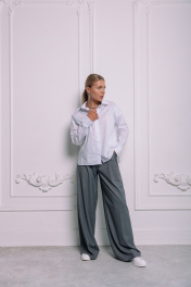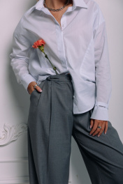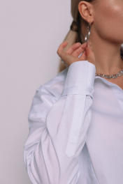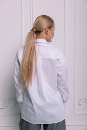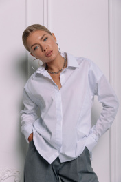 Базовая рубашка из гладкого хлопка. Спереди линию плеча продолжают диагональные отстрочки, воротник рубашечного типа. Рукав втачной с манжетой, подхваченной хлястиком по низу. В боковых швах выполнены фигурные разрезы. Длина рубашки по спинке в 42 р - 69 см, в 46 р - 71 см, в 48 р - 73 см. Ширина по линии груди в 42 р - 100 см, в 46 р - 108 см, в 48 р - 112 см.
