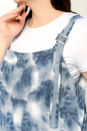 Трапециевидного силуэта с фигурными накладными карманами, нагрудными вытачками и разрезами в боковых швах. Бретели с тесьмой, люверсами и пряжками. Ткань- набивной текстиль.