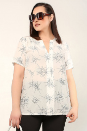 Женская блузка прямого силуэта с коротким втачным рукавом, планками по переду и разрезами в боковых швах. По плечам - кокетки со сборкой. По горловине - стойка и V- образный вырез. Ткань - набивной смесовый текстиль. Рост 170.