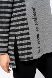 Туника прямого силуэта с круглым вырезом горловины, длинным втачным рукавом и удлиненной спинкой. Выполнена в комбинации полотна в гусиную лапку и компаньона с полоской. Нагрудные вытачки обеспечивают идеальную посадку по фигуре, а высокие разрезы в боковых швах-комфорт в носке. Перед декорирован двумя авторскими печатями.