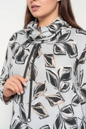 Свободного силуэта со спущенной линией плеча и длинным рукавом. Перед с нагрудными вытачками. Воротник-хомутик с кулиской, тесьмой и кольцами. В боковых швах- разрезы. Выполнено из набивного трикотажного полотна.