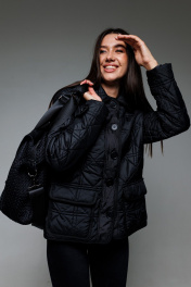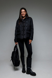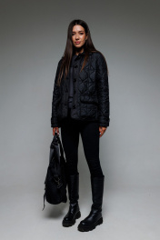 Женская куртка из стеганной плащевой ткани на утеплителе (подходит на температуру до 0 градусов). Куртка на подкладке. Рукава втачные, по низу рукава пата-манжет. Застежка центральная на притачных планках, на петли и пуговицы. Воротник рубашечный. По полочкам накладные карманы с клапаном. Край планки, низ рукавов, пата, воротник, карманы и клапаны окантованы тесьмой.
