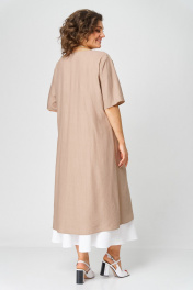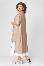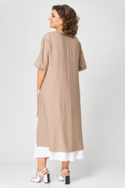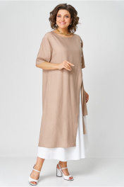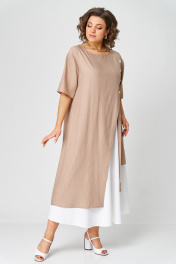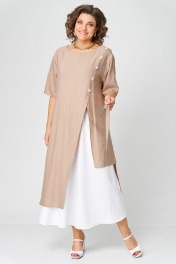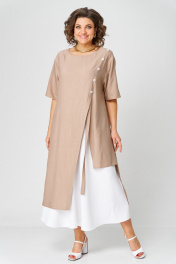 Женский летний комплект из легкой вискозной ткани. Комплект состоит из туники и юбки. Туника длинная, свободного силуэта, расширяющаяся к низу. По полочке от плечевого шва декоративная планка с пуговицами до уровня талии, переходящая в разрез. Левая часть полочки короче правой. Вырез горловины округлый. Рукав короткий втачной одношовный. Юбка четырехклинка, расширена к низу. Пояс притачной с широкой резинкой. Юбка без подкладки.