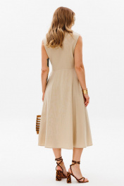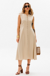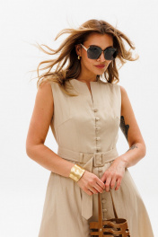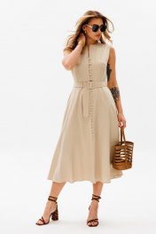 Летнее женское платье из ткани лен - вишер. Платье приталенного силуэта, расширенное к низу, отрезное по линии талии. Застёжка центральная на навесные петли и пуговицы. Вырез горловины фигурный. Без рукава, проймы обработаны косой бейкой. В боковом шве функциональные карманы. Платье без подкладки. В комплекте пояс из основной ткани, с пряжкой.