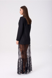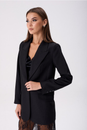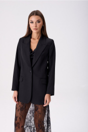 Жакет однобортный полуприлегающего силуэта. Рукав втачной 2х шовный,По низу рукав выполнена закрытая шлица и пришиты пуговицы. Воротник отложной. По переду центральная бортовая застёжка на одну петлю и пуговицу, лацканы отложныеи по отлёту скреплены с уступами воротника потайной закрепкой.Рельефы выходящие из пройм, а также талиевая вытачка и функциональные прорезные карманы в рамку с клапаном. По спинке средний шов и рельефы выходящие из проймы. Жакет на подкладке. Длина жакета по центру спинки -74см Длина рукава -62см