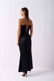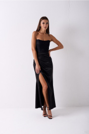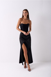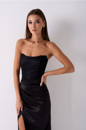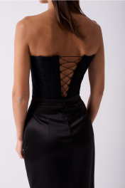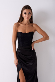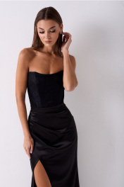 Комплект 2х предметный, состоит из корсета и юбки. Корсет 2х слойный состоит из верхнего слоя кружева и нижнего корсетного атласа. Корсет на подкладке из шёлка. По спинке воздушные навесные петли для шнуровки и шнур, с помощью которого можно плотно затянуть и завязать корсет и тем самым подчерунуть Женственность и красоту. Юбка длина макси из атласа, средней плотности . По переду по левой детали заложены глубокие складки, направленные вверх. По правой ноге деталь заходит под левую в полузанос, тем самым образовывая глубокую отлетную шлицу (разрез). По задней части юбки застрочены талиевые вытачки, по центру среднего шва притачана потайная тесьма молния. Юбка на поясе. Пояс с застёжкой с зади на прорезную петлю и пуговицу. Изделие можно носить и в комплекте и с другими изделиями, создавая различные стильные образы. Юбка длиной по боковому шву 90см.
