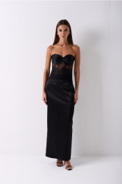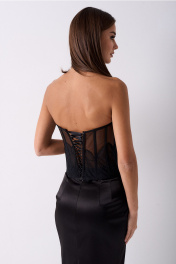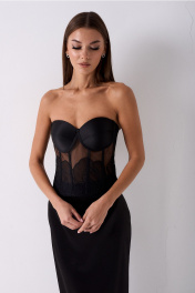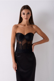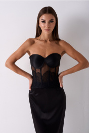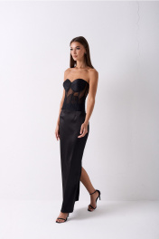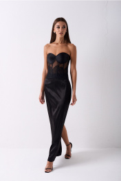 Комплект 2х предметный, состоит из полупрозрачного корсета ручной работы и юбки прямого силуэта длиной макси (впол) Корсет ручной работы, полпрозрачный, с плотными притачными формоустойчивыми чашками без эффекта "пуш-ап" . От низа по верху наишита корсетная сетка с вышитыми на ней линиями в виде роз. По спине корсет с навесными петлями и лентой для утягивания и завязывания корсета по фигуре. Юбка прямая, слегка заужена к низу. По переду 4 талиевые вытачки. По спинке средний шов с очень глубоким разрезом. Вверху 4 талиевые вытачки и по центру потайная тесьма-молния. Юбка на поясе с застёжкой на прорезную петлю и пуговицу. Изделие можно носить и в комплекте и с другими изделиями, создавая различные стильные образы. Длина юбки 90см.