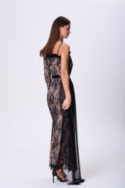 Платье вечернее, нарядное, для особенных и торжественных случаев. Силуэт полуприлегающий. Платье 2х слойное, по линии талии отрезное Верхний слой выполнен из французского кружева. Нижний слой из лёгкой смесовой ткани с шёлком. Платье с одним открытым плечём по правой руке и одним левым рукавом. По диагонали из под правой руки через левое плечо и по спинке проходит вверх поднятая из складок притачная деталь из атласной ткани. По правой части от рельефа пришита притачная, съёмная и регулируемая бритель. По центру спинки средний шов с застёжкой на потайную тесьму- молнию. Так же для прилегания застрочены талиевые вытачки. Низ подкладки застрочен швом в подгибку, в чистый край. Верхний слой платья по низу заканчивается цельно-вязаным фистоном с ресничками. Длина платья от плечевого шва до низа около 152см, или ниже уровня щиколотки