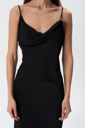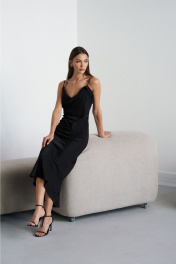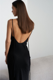 Платье прилегающего силуэта, изготовлено из натуральных, смешаных нитей. Ткань слегка крешованная, приятная к телу. Платье покроено под уголом 45 градусов (по косой), что благодаря такому крою изделие идеально сидит по фигуре, подчёркивая всю женственность и красоту. По верхнему срезу переда выполнена изгибистая, сложная деталь, в виде перекрученной качели. Спинка полуоткрыта. Платье фиксируется через плечи с помощью тоненьких брителей. Брители не регулируемые, а зафиксированы лёгкой закрепкой, которую можно самостоятельно подогнать под высоту своего плеча и полочки. Из свисающих длинных краёв брители можно дополнительно смоделировать линию по спинке, либо оставить в свободном провесании длину брителей. Верх платья обработан обтачкой. Длина изделия по боковому шву от проймы до низа 108см