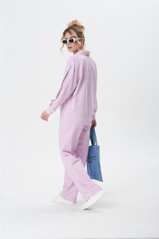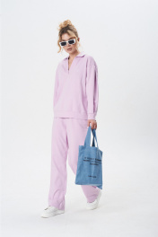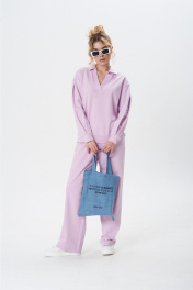 Костюм 2х предметный из натурального хлопка полотна френч-терри Джемпер свободный, по горловине с открытым вырезом и планкой переходящей в воротник. По низу притачан пояс. Рукав свободный с заложегой встречной складкой. По низу притачан манжет. По переду по левой стороне выполнена вышивка логотип бренда. Брюки прямые с боковыми карманами. Пояс притачной с вставленной во внутрь эластичной тесьмой(резинкой)