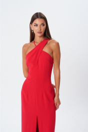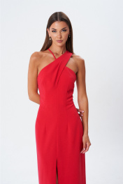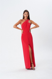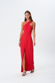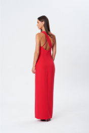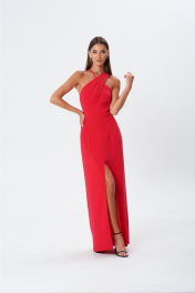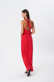 Вечернее, нарядное платье на все торжественные случаи в жизни. Платье " в пол". Силуэт полуприлегающий. По переду платье с центральным швом к низу который заканчивается глубоким разрезом, вверху переходящее в притачную широкую деталь и тонкую бритель,которые перехлёстывают друг друга и переходят на спинку и там фиксируются.Также по переду выполнены талиевые и нагрудные вытачки. Спина полуоткрыта По центру притачана длинная потайная молния . Прилегание выполнено за счёт застроченых талиевых вытачек. Срез спинки обработан обтачкой. Низ обмётан краеобмёточным швом и подшит на машине потайного стежка