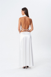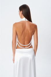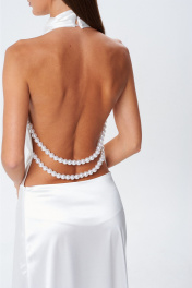 Вечернее, очень нарядное платье для самых торжественных случаев в жизни. Платье "в пол" выполнено по переду до линии талии ввиде спадающей качели, воротник -стойка с застрочеными складками и застёжкой сзади на воздушние петли и пуговицы. Платье отрезное по линии талии, облегающее по линии бёдер и слегка расширено к низу Спина полностью открыта . В боковые швы зафиксированы две пряди крупных под жемчуг бус, которые с провисанием красиво обыгрывают перегиб спины и лию талии.. Платье застёгивается при помощи потайной тесьмы-молнии в левом боковом шве.