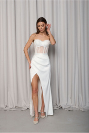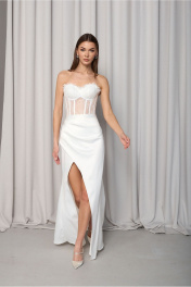 Комплект 2х предметный. Состоит из корсета и юбки Корсет ручной работы обшит кружевом шантильи. По чашкам кружево задраппировано в складки и закончен верхний край ресгичками По спинке корсет на шнуровке и петлях. Юбка длина макси из атласа, средней плотности . По переду по левой детали заложены глубокие складки, направленные вверх. По правой ноге деталь заходит под левую в полузанос, тем самым образовывая глубокую отлетную шлицу (разрез). По задней части юбки застрочены талиевые вытачки, по центру среднего шва притачана потайная тесьма молния. Юбка на поясе. Пояс с застёжкой с зади на прорезную петлю и пуговицу. Изделие можно носить и в комплекте и с другими изделиями, создавая различные стильные образы. Юбка длиной по боковому шву ок 90см
