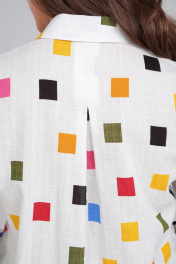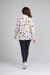 Блузка из натурального хлопка, лёгкая дышащая и свободного покроя. Плечевой шов спущен. Застёжка центральная бортовая на 8 петель и пуговиц. Пуговицы все ассорти по цветам. По переду два накладных кармана. По спинке частично застрочена встречная складка, которая расширяет свободу спинки. По переду два накладных кармана. По спинке частично застрочена встречная складка, которая расширяет свободу спинки. По боковым швам разрезы. Рукав длинный с манжетом Воротник на стойке. Длина блузки по спинке 71см, ширина спинки-39,5см, ширина на уровне глубины проймы(полуобхват) р44-50см,р46-52см р48-54см, р50-55см,р52-57см,р54-59см Ширина по линии бёдер(полуобхват) р44-53см,р46-55см,р48-57см,р50-59см,р52-61см,р54-63см Длина рукава на все размеры-57см и плюс приспущенное плечо Ширина рукава вверзу(полуобхват р44-17см,р46-18см,р48-19см,р50-20см,р52-21см,р54-22см