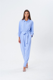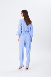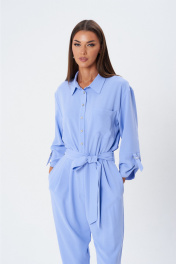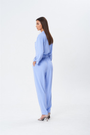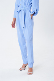 Комбинезон свободного силуэта, отрезной по линии талии. По переду один накладной карман нагрудный. Застёжка по переду лифа на прорезные петли и на пуговицы. Воротник на стойке с отложными краями. Брюки с карманами в боковых швах , с заложеными по переду мягкими складками и застёжкой на молнию в гульфике. Силуэт брюк типа "бананы". По низу брюки могут быть подвёрнуты в манжет, или просто лего спадать по ноге. По линии притачивания брюк к верху изделия проложена дополнительно эластичная тесьма(резинка), для прилегания по линии талии. По спинке и по переду верх свободно спадает лёгким напуском на линию талии. Плечо приспущено. Рукав втачной, с притачным манжетом и дополнительно для подворота притачана пата и два полукольца. По талии так же пришиты шлёвки и продет съёмный пояс Ткань струящаяся, дышащая и очень приятная к телу Длина по центру спинки до иалии-46см, длина брюк по боковому шву дл низа-104см Длина рукава с плечевым швом -60см