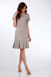 Платье женское, прилегающего силуэта, из текстильного материала. Вырез горловины обработан рубашечным воротником с отрезной стойкой. Перед и спинка платья с рельефными швами, идущими от пройм и переходящими по талии в боковые швы. Потайная застежка на тесьму - "молнию" в среднем шве спинки. Нижняя часть платья со встречнми складками. Рукава втачные, одношовные, короткие. Размеры 42-46: длина платья 97 см, длина рукава 18 см.