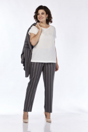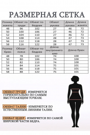 Костюм женский стильный офисный деловой брючный. Костюм брючный трех предметный. Состоит из жакета, блузы (полиэстер 100%) с коротким рукавом и брюк. Жакет прямого силуэта, без подкладки, удлиненный. Воротник пиджачного типа. Центральная застежка на петлю и пуговицу в размерах 48-52 и на две пуговицы 54-58. Детали переда с нагрудными вытачками, с большими накладными карманами с закругленными концами и клапанами, переходящими на спинку. На правой детали переда нагрудный накладной карман. Спинка со средним швом. Рукава втачные одношовные длиной 3/4. Низ рукавов с отложными манжетами. Карманы, клапаны, манжеты из отделочного материала. Блуза прямого силуэта, с круглым вырезом горловины, короткими цельнокроенными рукавами. Длина блузы по спинке 62-65 см. Брюки заужены к низу. Верхний срез брюк обработан притачным поясом, застегивающимся на петлю и пуговицу, по спинке на широкой эластичной тесьме. Центральная застежка на тесьму-"молнию". Наклонные карманы в боковых швах. Задняя часть брюк с талиевыми вытачками, имитацией карманов "с листочкой". С разрезами по низу.