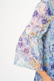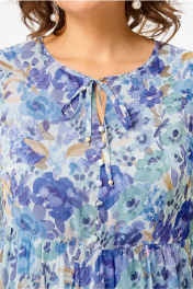 Платье А-силуэта, с круглым вырезом горловины,с завязками. Перед с нагрудными вытачками, пуговицами по среднему шву. Юбка платья состоит из 3-х воланов со сборками. Рукава втачные, одношовные, с воланами со сборкой, длиной 3/4. Платье на трикотажной подкладке.