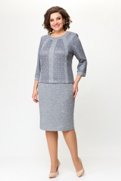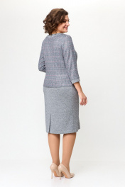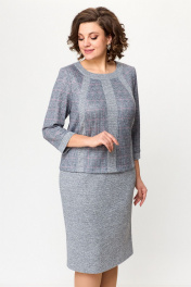Платье полуприлегающего силуэта изготовлено из трикотажного полотна двух видов - верхняя часть из полотна с рисунком в клетку, нижняя из однотонного серого трикотажа. Комфортное, приятное к телу, достаточно теплое. По переду изделия талиевые, нагрудные вытачки. Спинка с талиевыми вытачками, по низу со шлицей. Рукав втачной с притачной манжетой. По горловине притачная планка с округлым вырезом. Платье с плечевыми накладками, без подкладки. Длина спинки от плеча - 110 см Длина рукава - 49 см