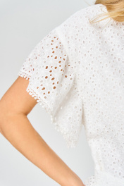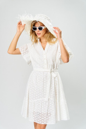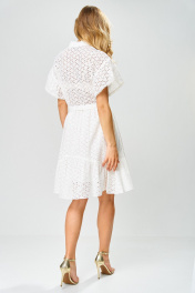 Платье женское из перфорированного хлопка, свободного силуэта, на подкладке,расширенное книзу, длиной ниже коленей,с втачной стойкой по горловине, отрезное на уровне линии талии, со съемным поясом. Лиф деталей переда платья с застежкой на 4 петли и 4 пуговицы, с «V-образным» вырезом, с нагрудными вытачками, исходящие от линии талии, с притачными планками. В шов притачивания планок вставлена декоративная тесьма. Юбка платья конической формы, с горизонтальным подрезом фигурной формы, по швам соединения обработана сборка. Рукава втачные одношовные, короткие, со сборкой по шву втачивания, низ рукавов декорирован отделочной тесьмой. По горловине втачная стойка с «рюшей». Длина рукава – 12см, ширина рукава – 33см, длина спинки – 98см.