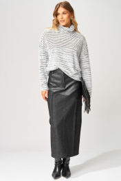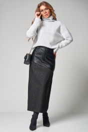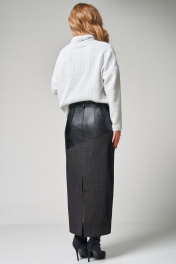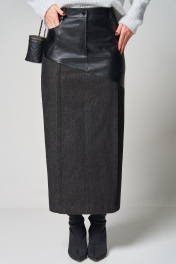 Стильная комбинированная юбка из экокожи и джинса от LAIKONY длиной «в пол». Юбка плотно облегающая вверху и прямая к низу. Застежка на тесьму-молнию и 1 кнопку. Переднее полотнище юбки со средним швом и асимметричным горизонтальным подрезом. В верхней части юбки обработаны карманы фигурной формы, нижняя часть с рельефными складками. Заднее полотнище юбки с вытачками, асимметричным подрезом и средним швом, который заканчивается разрезом. По поясу юбки прикреплены 5 шлевок. Декор может отличаться от представленного на фотографии. Ткань не тянется. Длина изделия по спинке 86 см. Шикарная юбка для офиса и повседневного использования. Образ на фото с нашим джемпером L-001-1