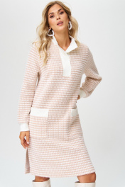 Платье женское, повседневное, свободного силуэта, с втачными рукавами, длиной ниже коленей, с втачной стойкой по горловине, со съемным поясом. Деталь переда платья с нагрудными вытачками, с втачной планкой, с 2-мя накладными карманами. Рукава втачные одношовные, с притачными манжетами. Вырез горловины платья «под горло», с втачной стойкой, в боковых швах обработаны разрезы. Декор может отличаться от представленного на фотографии. Платье: длина рукава - 61см, ширина рукава – 18,5см, длина спинки – 99см.