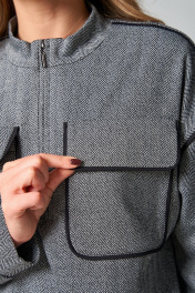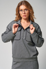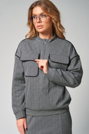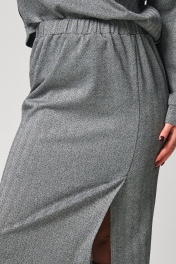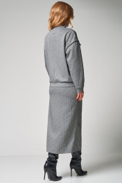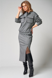 Стильный трикотажный комплект от LAIKONY свободного силуэта, состоящий из джемпера и брюк. Джемпер длиной до линии бедер. Воротник-стойка втачной, застежка на тесьму-молнию по центру. Спереди расположены карманы с клапанами фигурной формы и с отделочными кантами. Спинка цельная. Рукава втачные одношовные, с притачными манжетами. Линия плача спущена. По плечевым и по боковым швам, по швам втачивания рукавов вставлен отделочный кант. По низу джемпера идет притачная планка. Длина джемпера по спинке 55-61 см, длина рукава 52-53,5 см от шва втачивания в зависимости от размера. Юбка плотно облегающая вверху и прямая к низу, длиной до середины икр. Пояс притачной, в который вставлена эластичная тесьма. Переднее полотнище юбки с рельефным швом, который заканчивается шлицей. Длина юбки 81 см. Декор может отличаться от представленного на фотографии. Трикотаж средней плотности, тянется. Наш модный комплект идеально подойдет для офиса и повседневного использования.