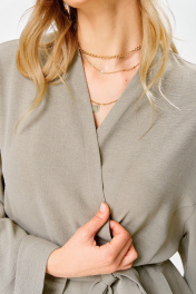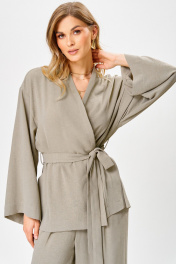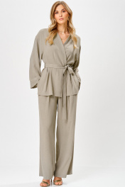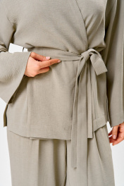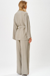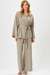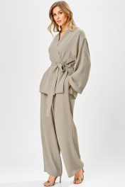 Жакет женский из мягкой костюмно-плательной ткани с креш-эффектом, свободного силуэта, длиной ниже линии бедер, со спущенной линией плеча, с втачными рукавами, в боковых швах обработаны разрезы, со съемным поясом. Детали переда жакета с отрезными бочками. Деталь спинки жакета с втачной стойкой, переходящей на перед. Рукава втачные одношовные, широкие. По боковым швам на уровне линии талии прикреплены шлевки для протяжки съемного пояса. Брюки на бедрах, облегающие вверху и прямые к низу, с притачным поясом, в который вставлена эластичная тесьма. На передних половинках брюк в боковых швах обработаны наклонные карманы. Жакет: длина рукава – 51,5см, ширина рукава – 26см, длина спинки – 75,5см. Брюки: длина по боковому шву – 106см.