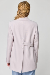 Жакет свободного силуэта, на подкладке, длиной ниже линии бедер, с центральной сквозной застёжкой на 2 петли и 2 пуговицы до линии перегиба лацкана, со съемным поясом. Детали переда с отрезными бочками, горизонтально расположенными боковыми прорезными карманами с листочками, и талиевыми вытачками от разрезов карманов. Спинка жакета с плечевыми вытачками и средним швом, который заканчивается высокой шлицей с застежкой на 2 петли и 2 пуговицы. Рукава втачные двухшовные, с передним и локтевым швами. Понизу локтевых швов декоративно прикреплены по 3 пуговицы. Воротник отложной пиджачного типа. Углы воротника и лацканов прямые. Края воротника, лацкана, борта, клапанов обработаны в чистый край. Жакет с притачной понизу подкладкой. Длина спинки – 73см. Длина рукава – 61,5см, ширина рукава – 19,5см.