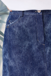 Юбка на талии, плотно облегающая вверху и расширенная к низу, длиной до середины икр, с притачным поясом. Застежка на тесьму-молнию и 1 петлю и пуговицу-«болт». Переднее полотнище юбки со средним швом, который заканчивается разрезом, с рельефными швами, в боковых швах обработаны карманы фигурной формы, на правом бочке расположен «часовой» карман. По боковым обработаны вытачки. Заднее полотнище юбки со средним швом и с кокетками, с 2-мя накладными карманами.Юбка: длина середины спинки (без пояса) – 83см.