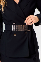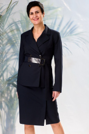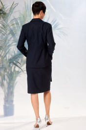 Жакет женский из костюмной ткани темно-синего цвета, прилегающего силуэта, на подкладке, длиной ниже линии бедер, с втачными рукавами, с центральной сквозной двубортной застежкой на 2 петли и 2 пуговицы и 1 потайную петлю и пуговицу до линии перегиба лацкана (и 2 декоративные), со съемным поясом. Детали переда жакета с отрезными бочками, центральные части с нагрудными вытачками, на боковых частях вертикально расположены прорезные карманы с листочками. Деталь спинки жакета с плечевыми вытачками, с рельефными швами и со средним швом. Рукава втачные двухшовные, с передним и локтевым швами, внизу локтевых швов оформлен декоративный элемент из двух кнопок и отделочной строчки. Воротник отложной пиджачного типа. Углы воротника и лацканов острые. Края воротника, лацкана, борта, клапанов обработаны в чистый край. Жакет с притачной понизу подкладкой. Низ жакет фигурной формы. Юбка женская на талии из костюмной ткани темно-синего цвета, плотно облегающая вверху и прямая к низу, на подкладке, с притачным поясом, длиной до коленей, с застежкой на потайную тесьму-молнию в левом боковом шве. Переднее полотнище юбки с одной вытачкой и с рельефным швом-складкой, который заканчивается шлицей. Заднее полотнище с 2-мя вытачками. Верхний срез юбки обработан обтачкой. Декор может отличаться от представленного на фотографии. Жакет: длина рукава - 62см, ширина рукава – 19см, длина спинки – 65см. Юбка: длина середины спинки – 58см.