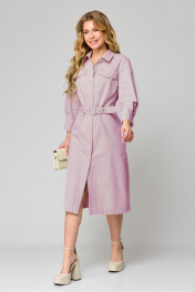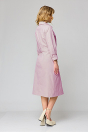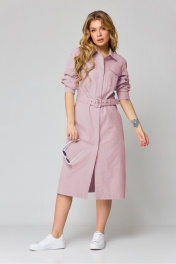 Платье женское, прилегающего силуэта, расширенное к низу, длиной ниже линии коленей, с втачными рукавами, с втачным воротником, отрезное на уровне линии талии, с центральной потайной застежкой на 9 кнопок и 1 кнопку на стойке воротника, со съемным поясом. Лиф деталей переда платья с кокетками, в швах вставлены клапаны, с 2-мя рельефными швами, на центральной части накладной карман. Лиф детали спинки платья с кокеткой, нижняя часть с рельефными швами. Юбка платья конической формы, в боковых швах обработаны карманы, заднее полотнище со средним швом. На уровне линии талии со стороны спинки прикреплены шлевки для протяжки пояса. Рукава втачные одношовные, с притачными манжетами, с застежкой на 2 кнопки. Разрезы обработаны окантовкой, по швам притачивания заложена бантовая складка. Воротник сорочечный с отрезной стойкой. Длина спинки – 109см. Длина рукава - 49см, ширина рукава – 20,5см.