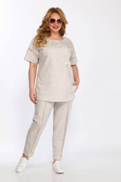 Комплект двухпредметный: туника и брюки. Выполнен из натурального льна с вискозой и отделкой - кружевной тесьмой. Туника слегка удлиненная, свободного силуэта с цельнокроеным коротким рукавом (по рукаву - полоска кружевной тесьмы). У выреза горловины складочки и отделка кружевной тесьмой. В нижней части внутренние карманы. Спинка чуть ниже переда, по среднему шву застежка молния. По боковым швам разрезы. Брюки "полубананы" оформлены притачным поясом (сзади резинка), застежка молния и пуговица. Впереди накладные карманы (вход у боковых швов), по центру вертикальные вставки из кружевной тесьмы, внизу притачные манжеты с отворотом. Длина туники сзади по спинке от плечевого шва 78см, длина рукав 27 см, длина брюк 101см