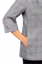 Жакет на подкладке, выполнен на основе классического кроя, с отложным воротником и лацканами, застежка на 2 пуговицы, в рельефных линиях – внутренние карманы. По спинке – шов. Рукав ¾, манжета с отворотом.