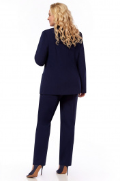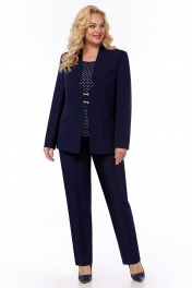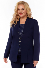 Комплект женский трехпредметный: жакет, брюки, блузка. Жакет на подкладке, полуприлегающего силуэта, без воротника, с красивым фигурным вырезом горловины, с левой стороны – листочка, на полочках переда карманы, которые входят в рельефные швы. Рукав длинный. Застежка «в стык» на эффектные крючки с декором. Благодаря такой застежке, из-под жакета видна блузка из тонкого трикотажа с принтом, это придает больше женственности официальному образу костюма. Блузка со вставками на лифе, рукав короткий. Брюки классического кроя, слегка заужены к низу. Оформлены притачным поясом (по бокам резинки), застежка «молния» + пуговица. Длина жакета 70 см, длина рукава 63 см. Длина брюк по боковому шву 110 см. Длина блузки 68 см, длина рукава блузки 22 см.