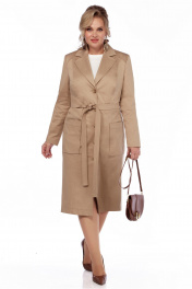 Плащ полуприлегающего силуэта, длина ниже колена. Отложной воротник - лацканы, застежка на пуговицы. Впереди кокетки и вертикальные рельефы. Накладные карманы декорированы пуговицами. По спинке кокетка, вертикальные рельефы, центральный шов и шлица. Рукав длинный со шлицей и пуговицами. Плащ на подкладке, дополнен съемным поясом.